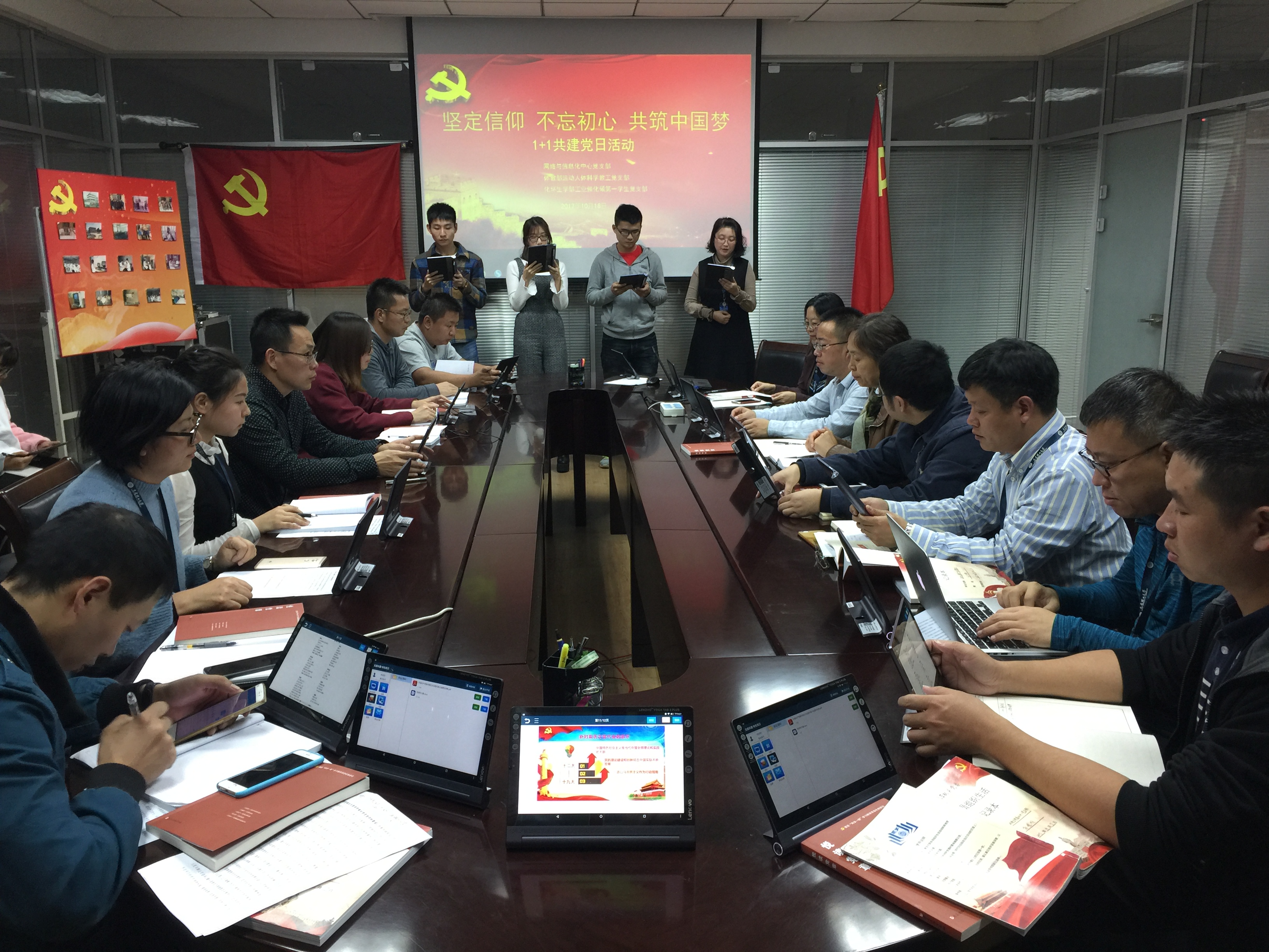 10月18日,为扎实推进“两学一做”学习教育常态化制度化,增强基层党组织的凝聚力和战斗力,网信中心党支部联合体教部运动人体科学教工党支部和化环生学部工业催化硕第一学生党支部举行了主题为“坚定信仰 不忘初心 共筑中国梦”的“1+1”共建党日活动,机关党委书记王涌涛老师受邀参加了此次活动。此次党日活动共有四大板块内容,分别是结合十九大召开介绍党新时期历次全国代表大会的理论贡献和创新历程;学习《悦读党章》第二章;理想信念图片展;集体诗朗诵“信仰的力量”,活动由网信中心党支部书记翟鸣宇主持。