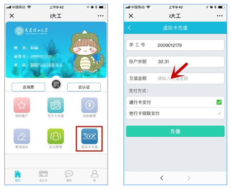 方式一:线上充值。通过“i大工”的“虚拟卡充值”即可实现银行卡向虚拟卡的充值。