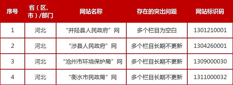 在本次抽查中,涉及河北的存在突出问题的政府网站名单如下: