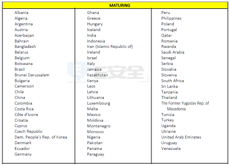 国际电联根据GCI分数将193个国家分为三个阶段: