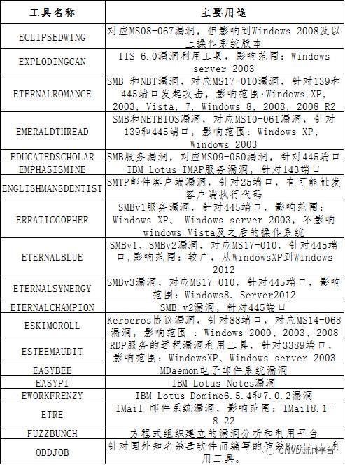 Shadow Brokers发布了黑客使用的大量针对Windows操作系统、银行专用系统以及其他广泛应用的服务器软件产品的工程化工具,涉及的产品包括:Windows操作系统及其IIS和SMTP客户端服务组件、IBM Lotus办公服务组件、MDaemon邮件系统、IMAIL邮件系统等,其中威胁较大的漏洞利用工具如下: