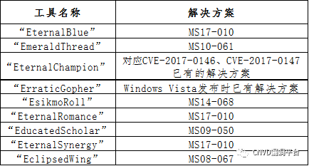 根据微软官方发布的声明称,上述表项中涉及的大部分漏洞已在微软支持的产品中修复,微软官方公告的解决方案对应表如下表所示。由于微软已经停止对Windows XP和Windows Server 2003的安全更新,因此对于XP和2003用户以及其他未打补丁的用户直接构成攻击威胁。